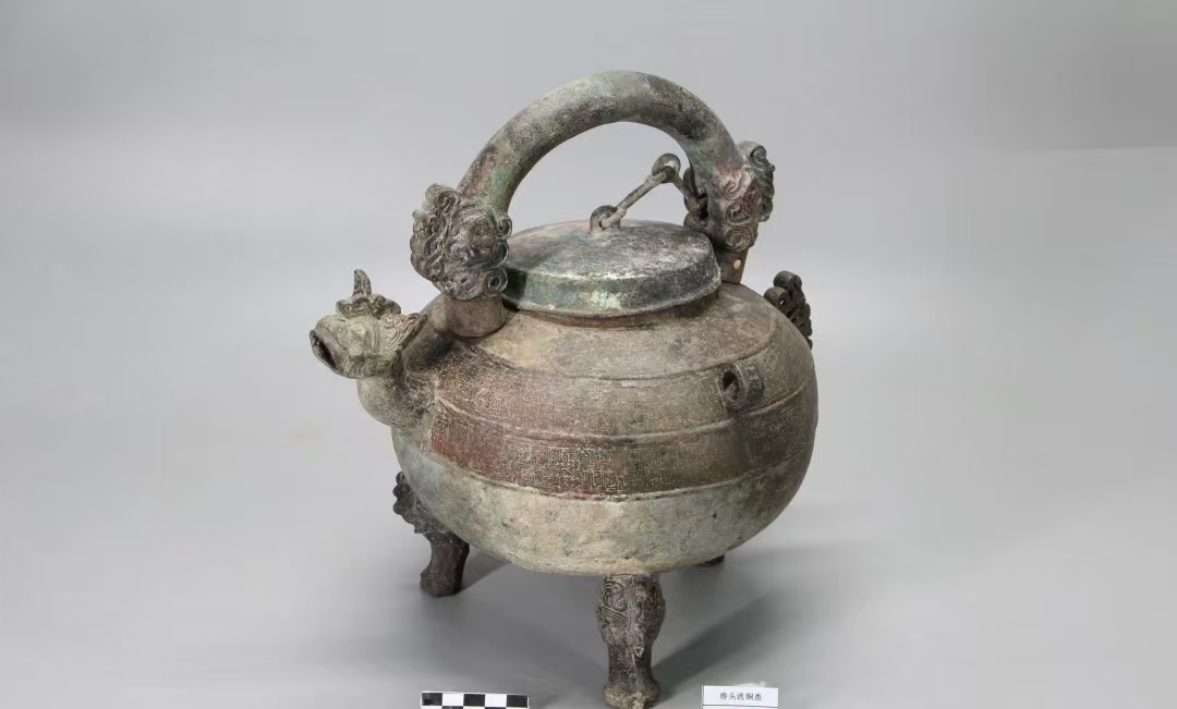 春秋时期铜盉,国家二级文物,1991年7月贺州市八步区沙田镇龙中村出土,现珍藏于贺州市博物馆。口径10.2厘米,腹径21.3厘米,高21厘米、盖径1.5厘米,足高7厘米。小直口,有盖,广肩,兽头流,扁圆腹,圜底,三兽足。流为短曲状的抬头兽首:椭圆形吻, 鸡冠形角,三角大耳,三角眼,鼻侧有须,颈部饰麟纹。整为棱脊形,镂成空心的蟠螭纹。肩部前后饰乳凸形耳,两侧饰桥形扁钮。盖面饰交体龙纹一周,环形钮,钮套铜链。